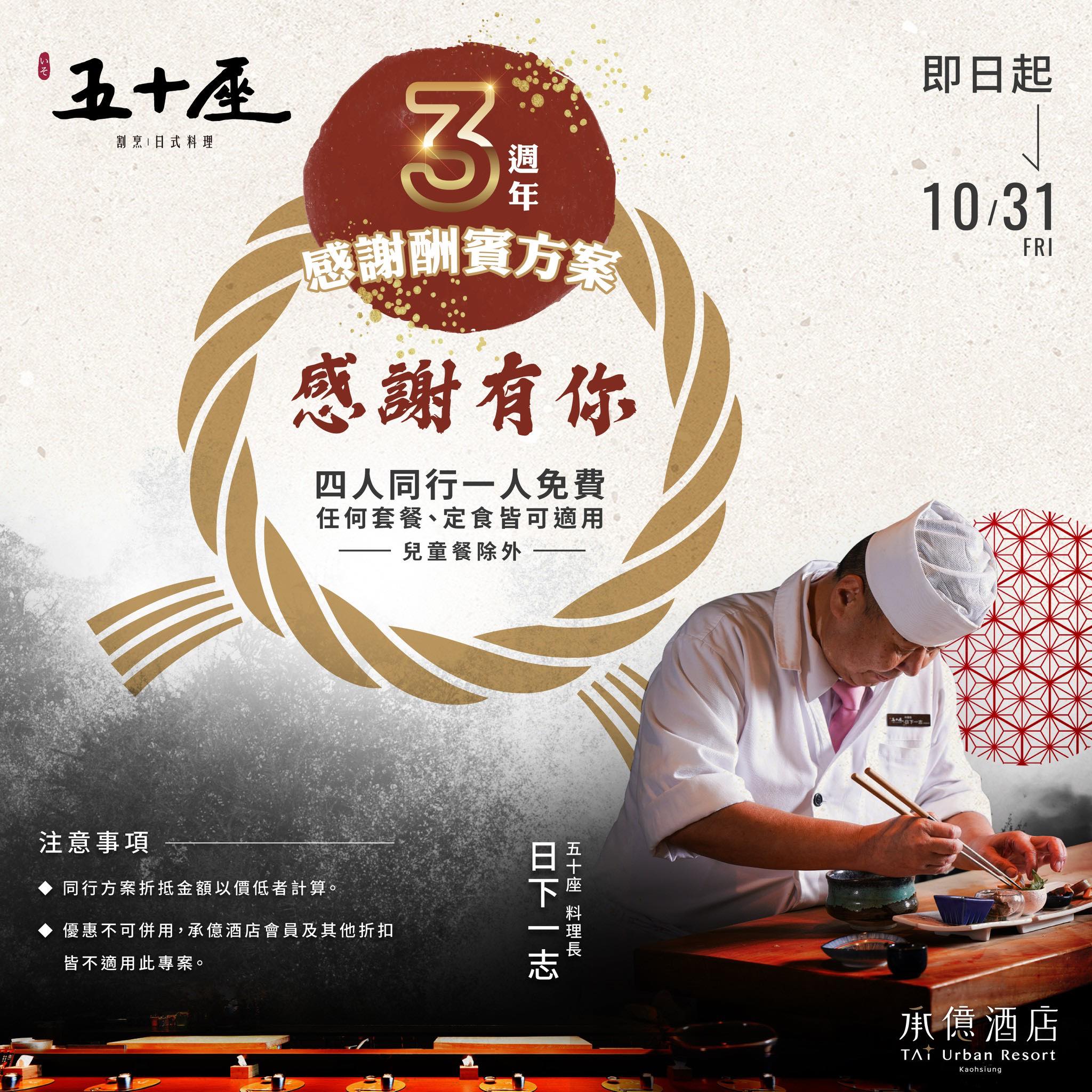 更重要的是,五十座懷石日本料理3週年慶・四人同行一人免費的活動,真的太划算!