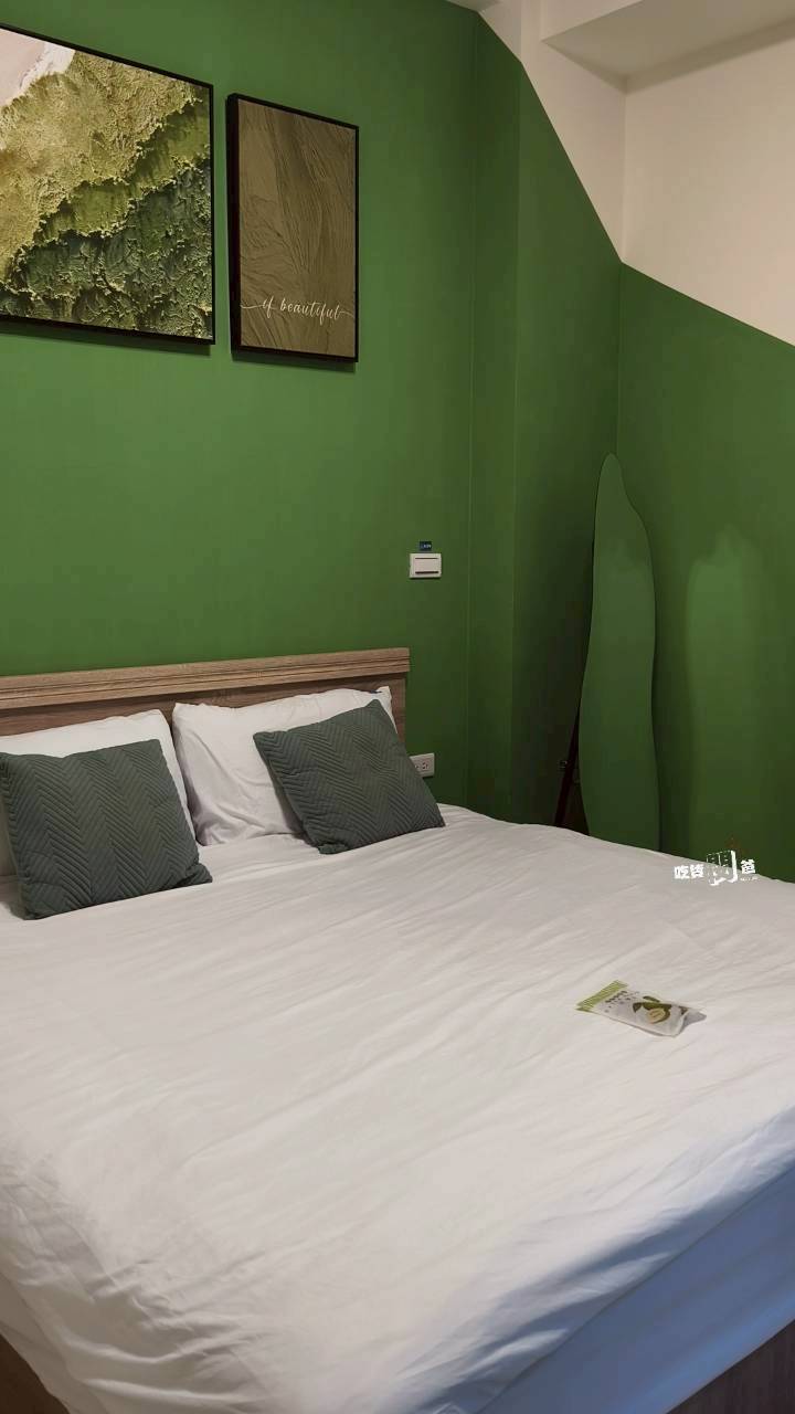 房間是柔軟的雙人床,草綠色系的牆面格外有活力,床前是露天陽台,也有一台大電視跟床頭櫃可以置放使用,休息空間是恰到好處。